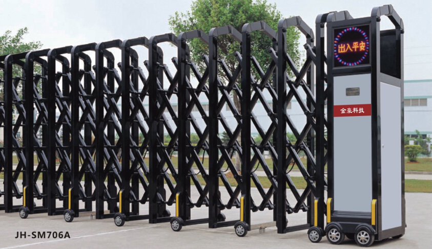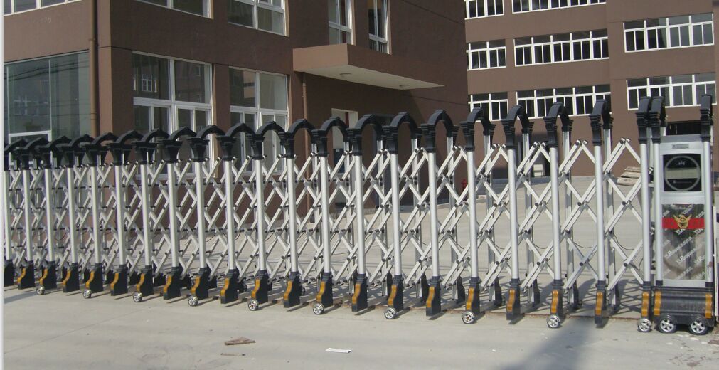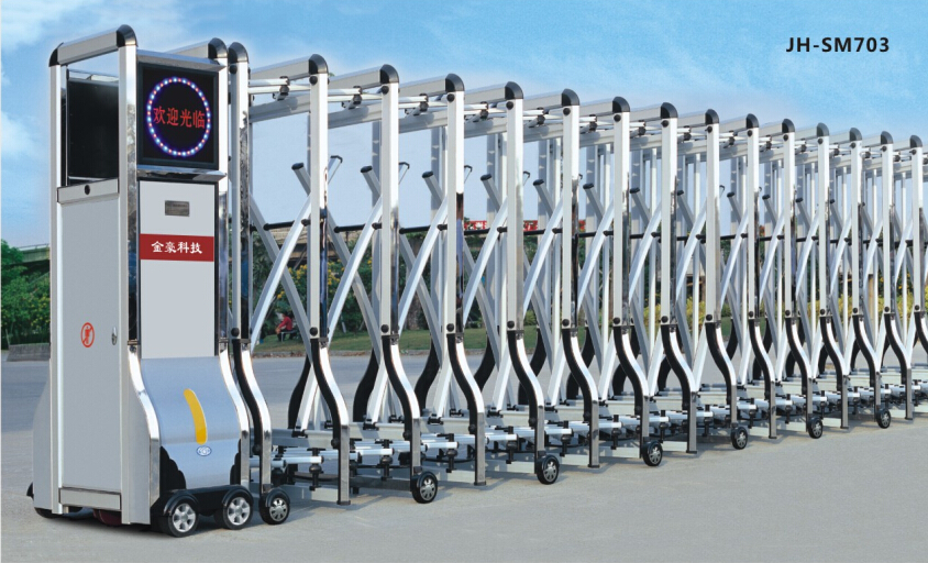 電動(dòng)伸縮門的組成:自動(dòng)伸縮門主要由門體、驅(qū)動(dòng)器、控制系統(tǒng)構(gòu)成。門體采用優(yōu)質(zhì)不銹鋼及鋁合金專用型材制作,采用平行四邊形原理鉸接,伸縮靈活行程大。驅(qū)動(dòng)器采用特種電機(jī)驅(qū)動(dòng),蝸桿蝸輪減速,并沒有手動(dòng)離合器,停電時(shí)可手動(dòng)啟閉??刂葡到y(tǒng)有控制板,按鈕開關(guān),另可根據(jù)用戶需求配備無線遙控裝置??膳鋫錆L動(dòng)顯示屏,顯示500字的顯示內(nèi)容。還可配備智能紅外線雙探頭防碰撞裝置,遇人或異物20-30CM可自動(dòng)返回運(yùn)行,從而保障車輛及行人的安全。