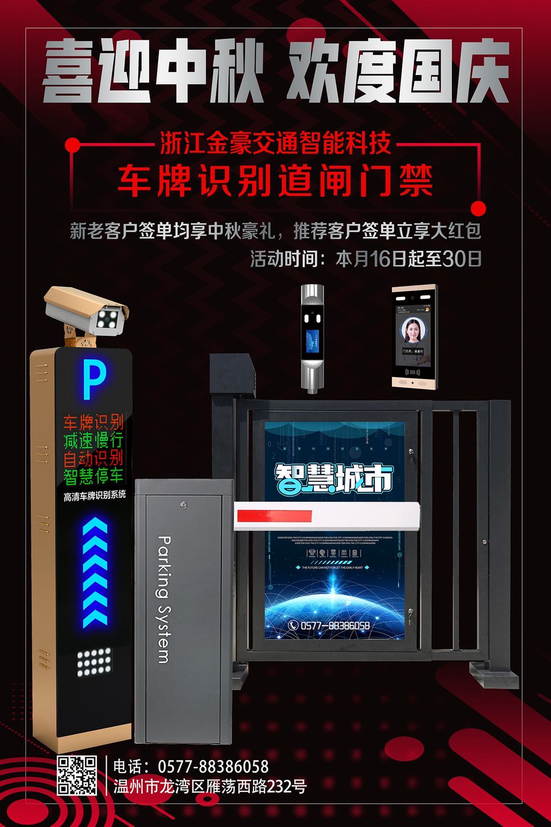 隨著中秋佳節(jié)來(lái)臨之際,金豪為了答謝廣大客戶的常年支持與信任,特此祝您:全家歡樂團(tuán)圓,幸福美滿,福降門前,好運(yùn)連連,財(cái)神眷戀,四海來(lái)緣!在送祝福的同時(shí)也給諸位準(zhǔn)備了一大波簽單中秋豪禮?。”姸喈a(chǎn)品:崗?fù)?,旗桿,吸煙亭,移動(dòng)廁所,車牌識(shí)別系統(tǒng),道閘,伸縮門等任君選擇!時(shí)間有限!!好機(jī)會(huì)千萬(wàn)不要錯(cuò)過哦,趕緊撥打電訂購(gòu)吧:0577--88386058