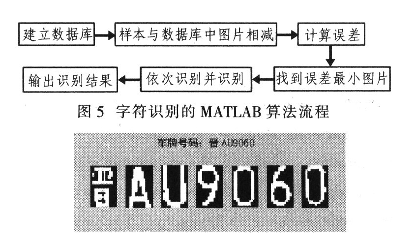 字符識別:對分割后的字符進行縮放、特征提取,與字符數(shù)據(jù)庫模板中的標準字符表達形式進行匹配判別。